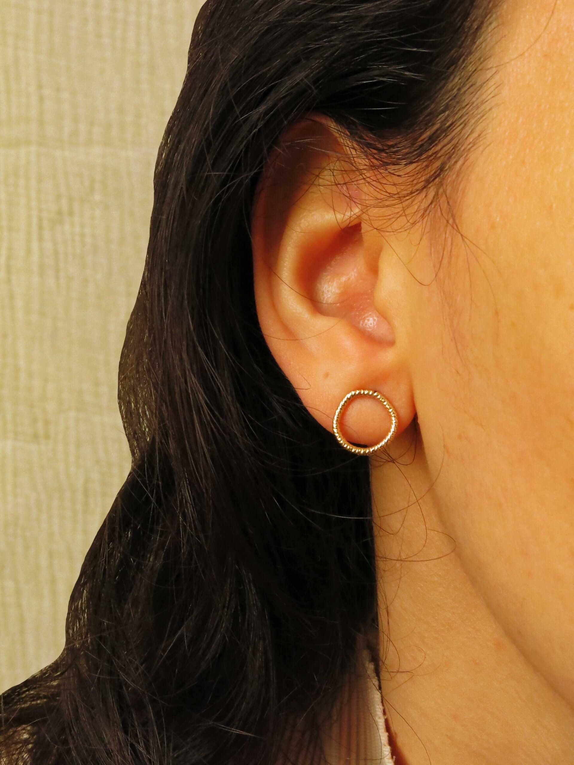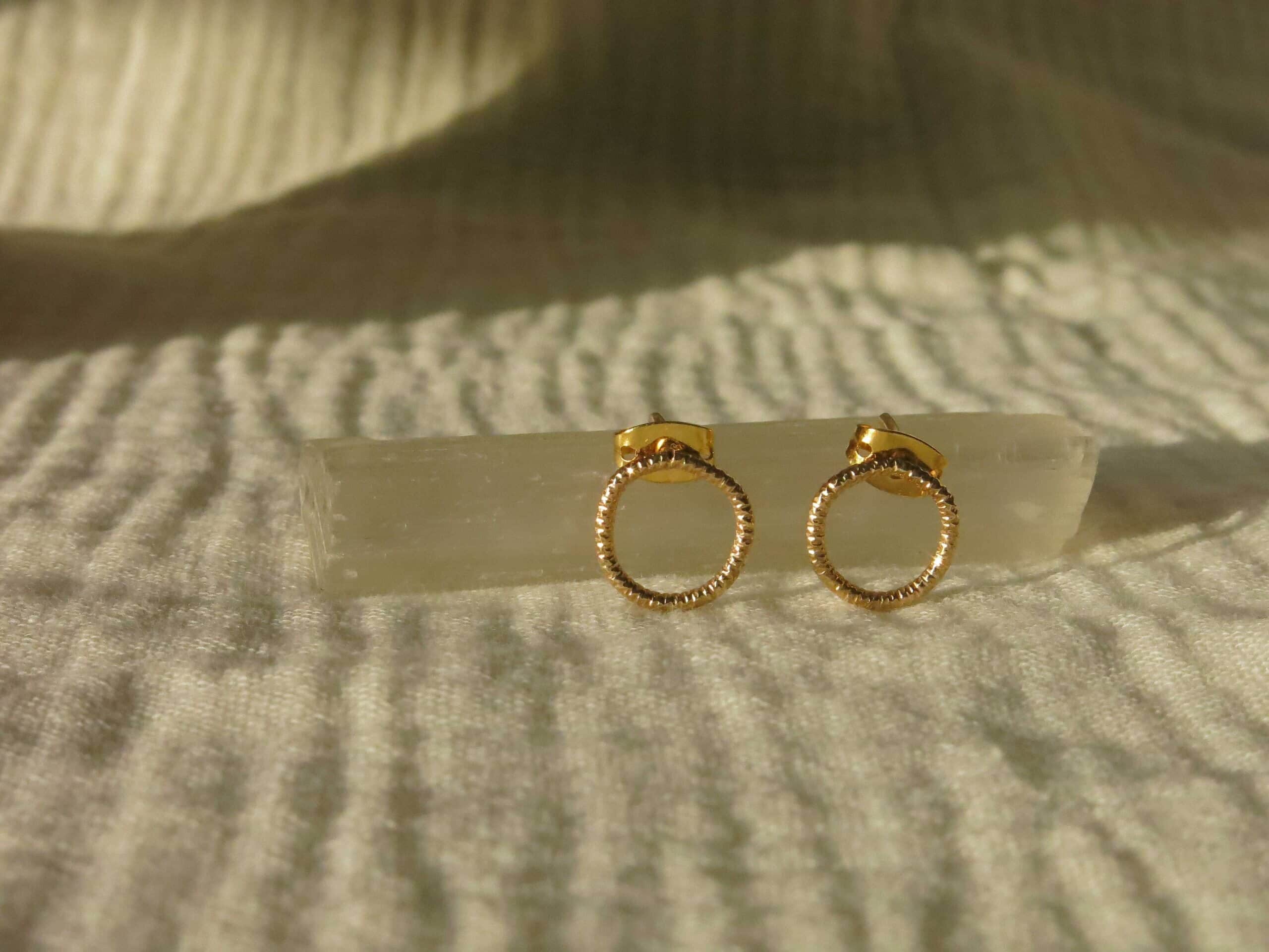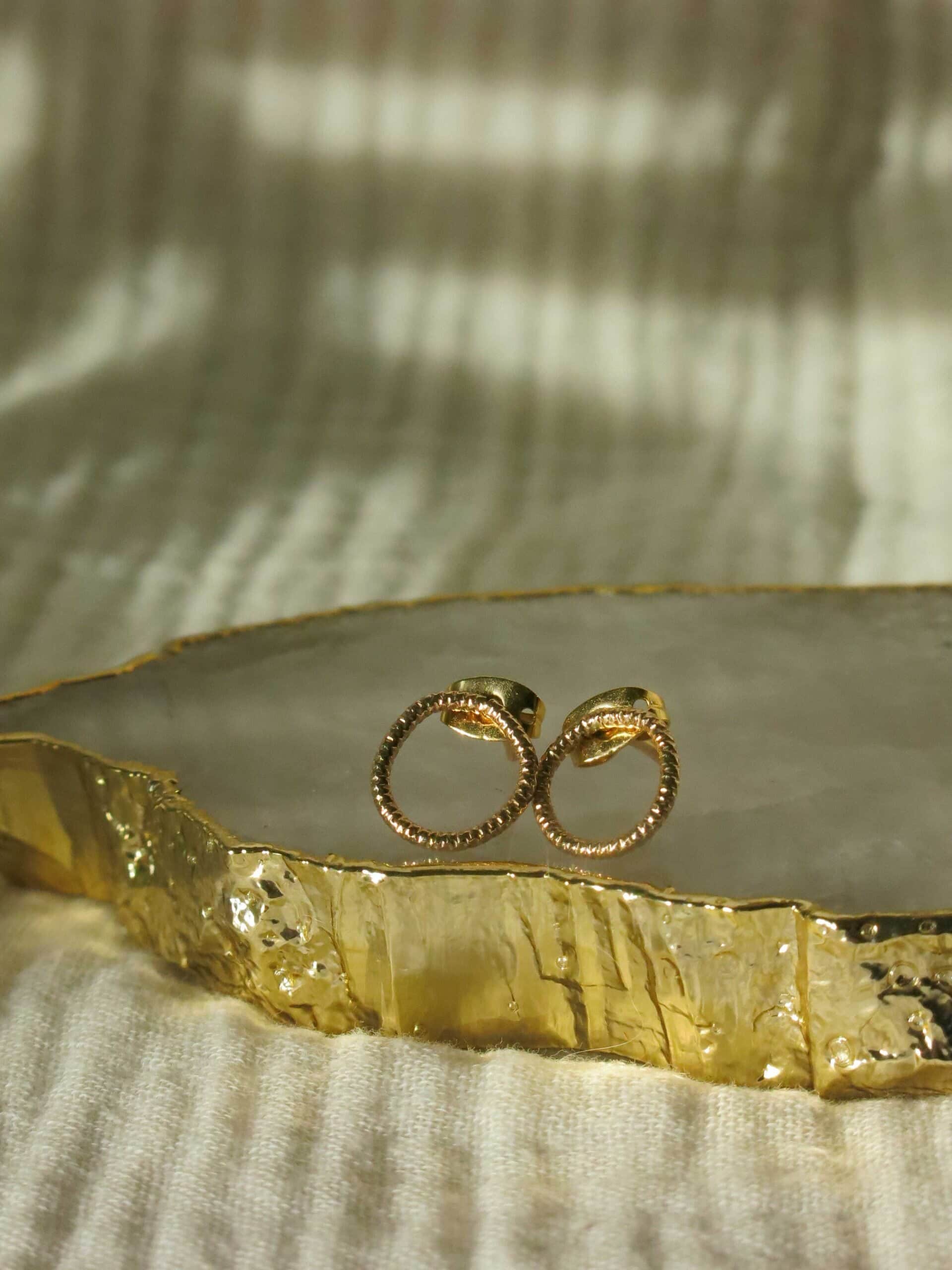 Les boucles Guaraci sont de petites amulettes solaires, lumineuses et délicates, pensées pour illuminer chaque instant. Leur texture granuleuse et torsadée capture la lumière comme un rayon de soleil tropical. 🌞