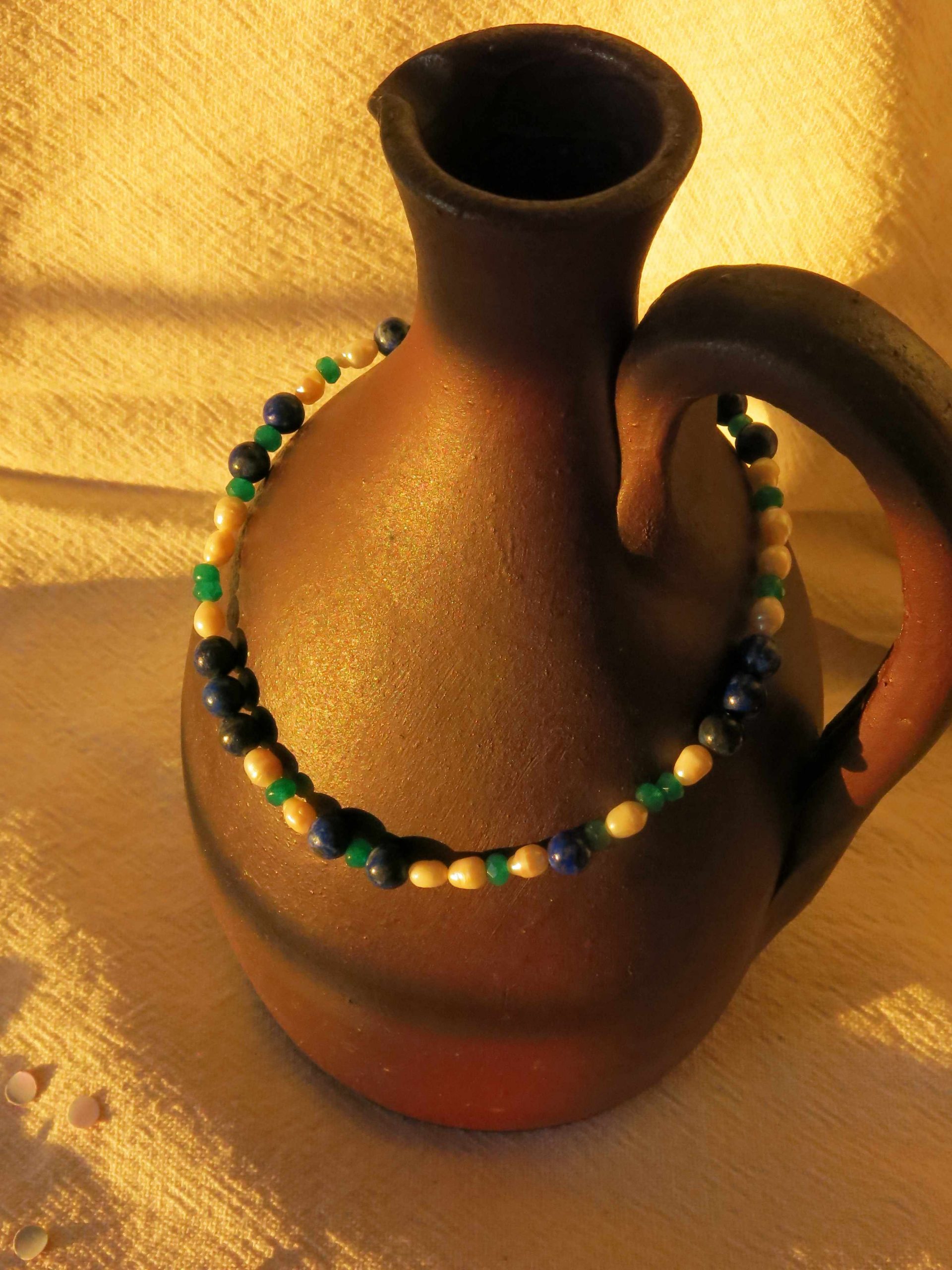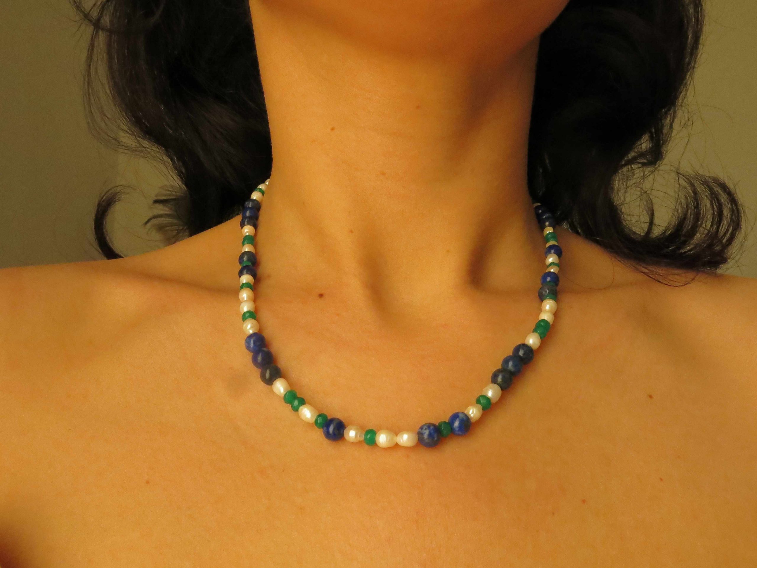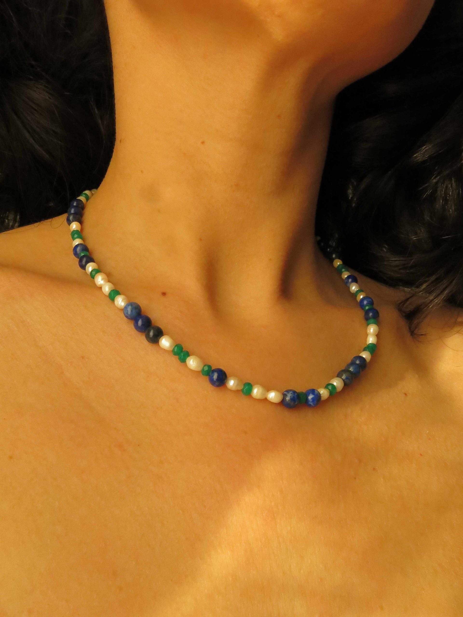 Matériaux : lapis-lazuli 8 mm, jade vert, perles d’eau douce (~2 mm). Pendentif feuille & chaînette en laiton plaqué or 18 carats