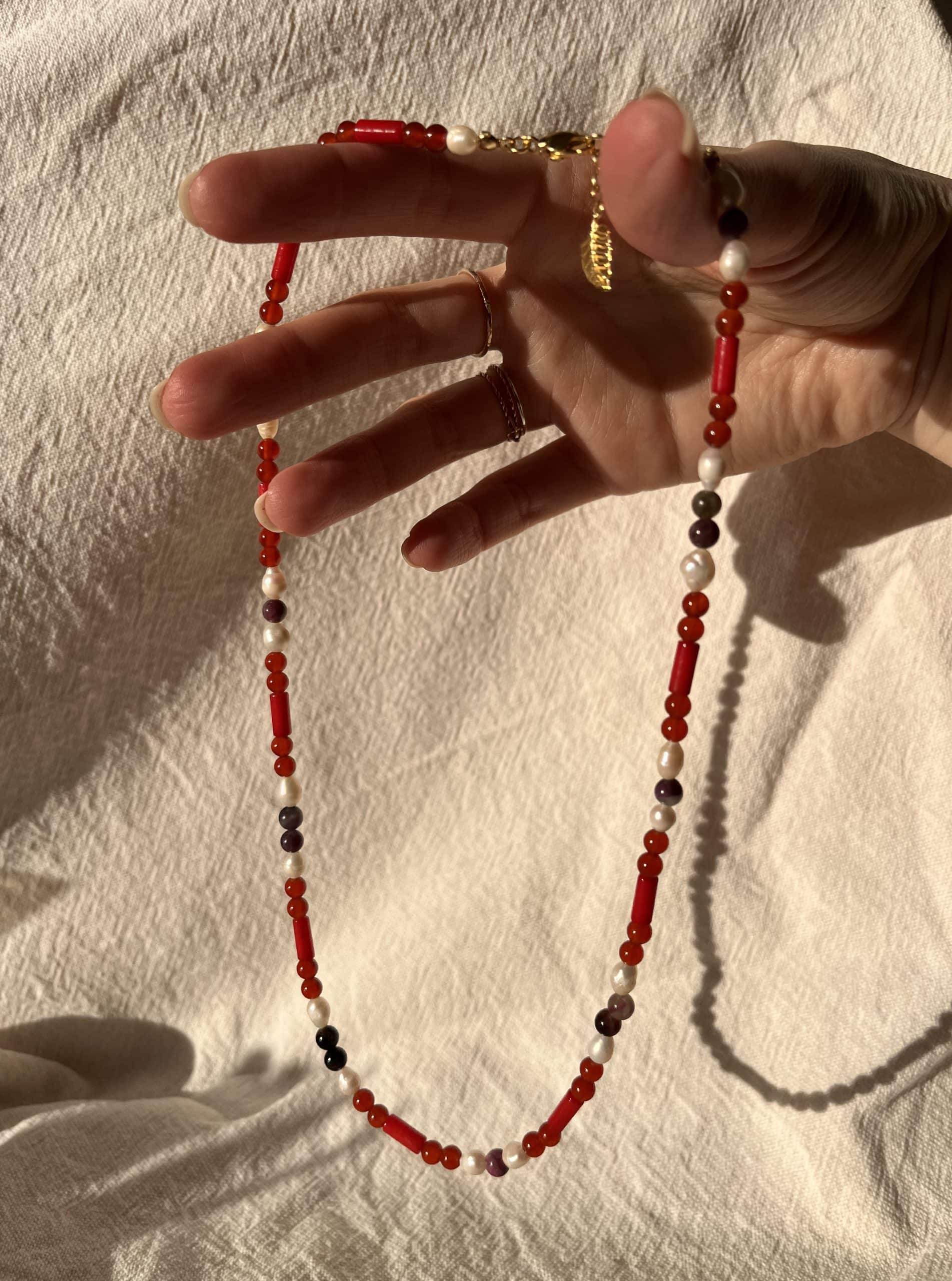 Une amulette artisanal vibrante mêlant les pierres naturelles cornaline, tourmaline et perles d’eau douce pour une énergie joyeuse et intuitive. Détails en plaqué or.