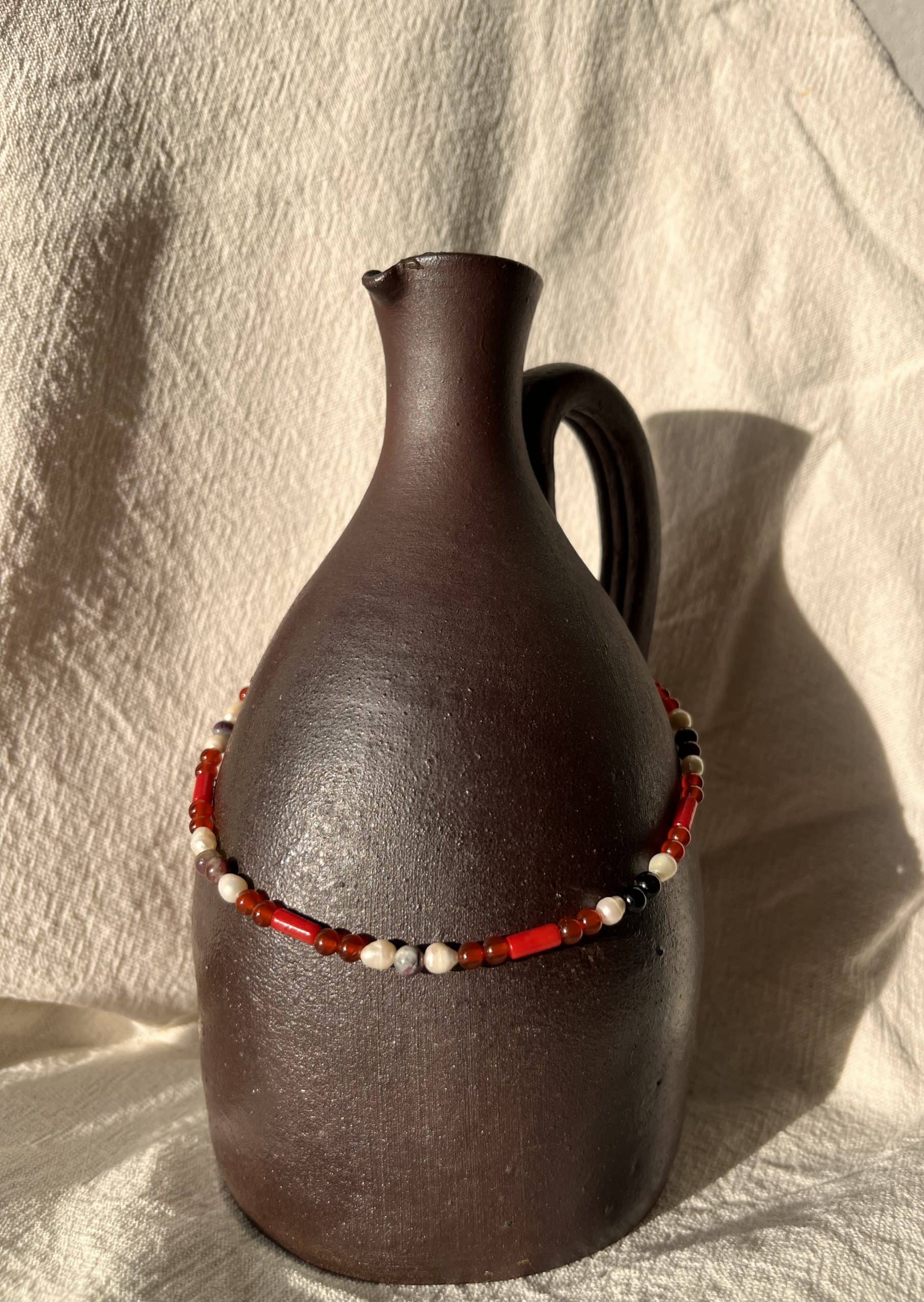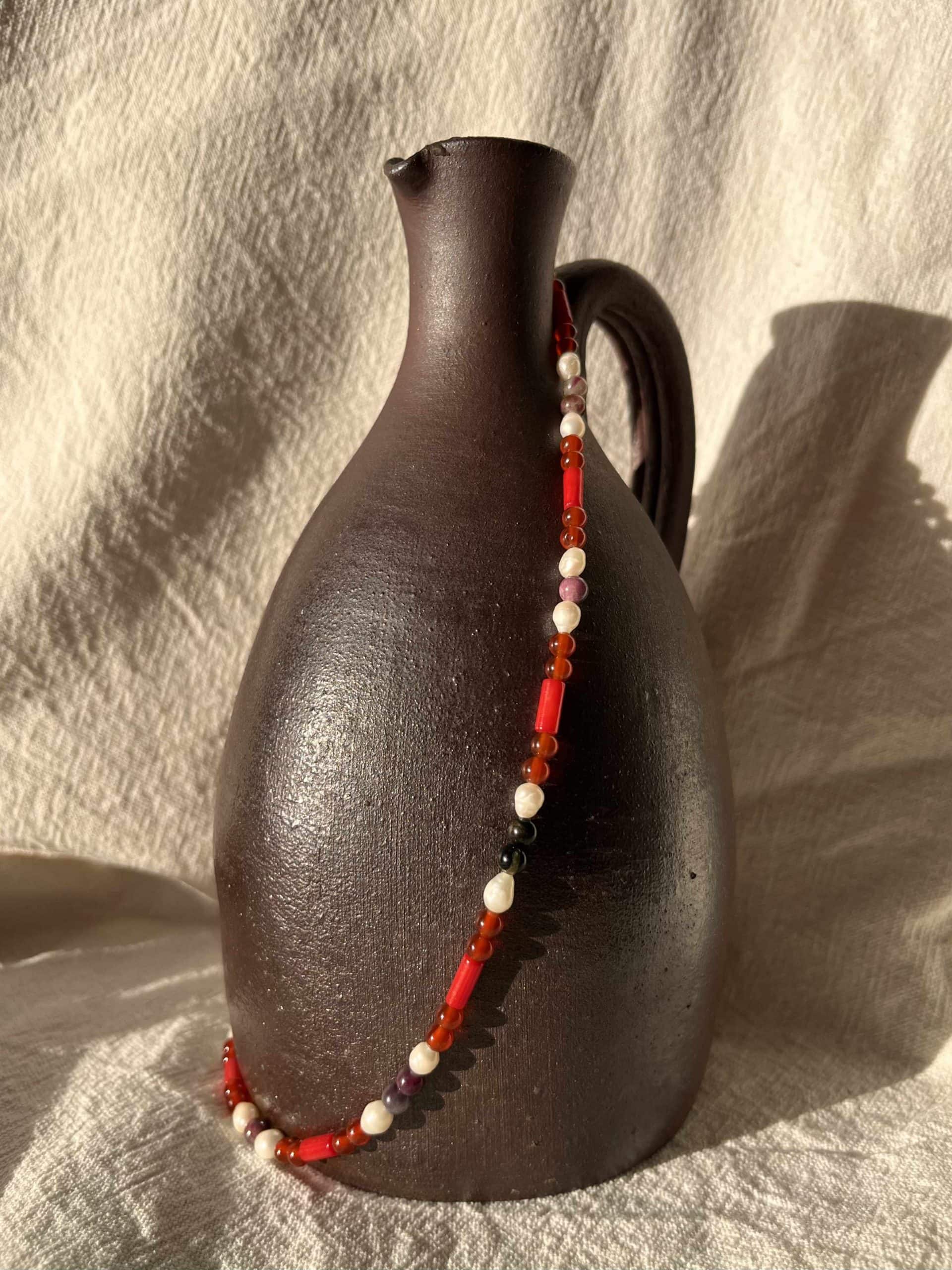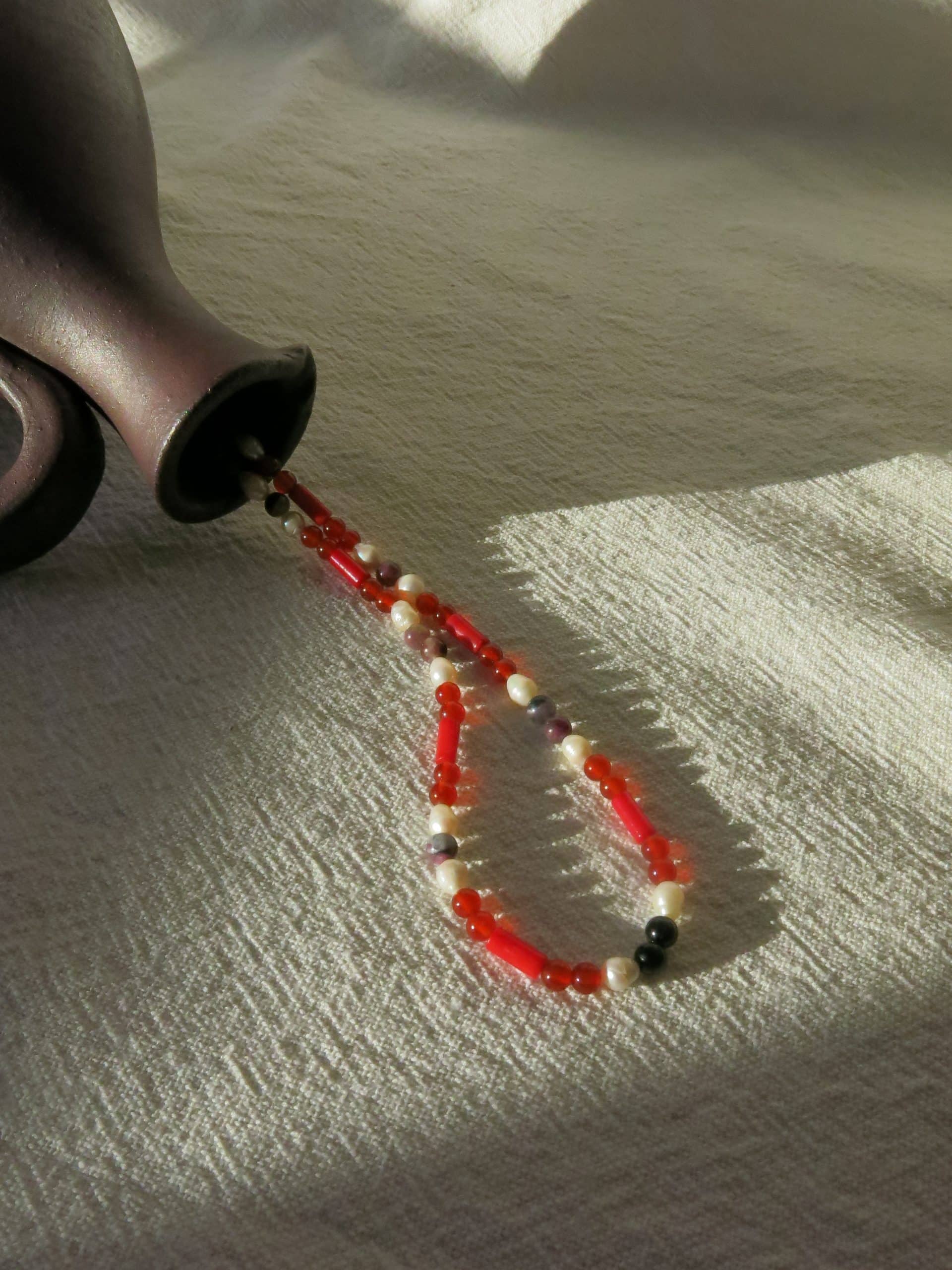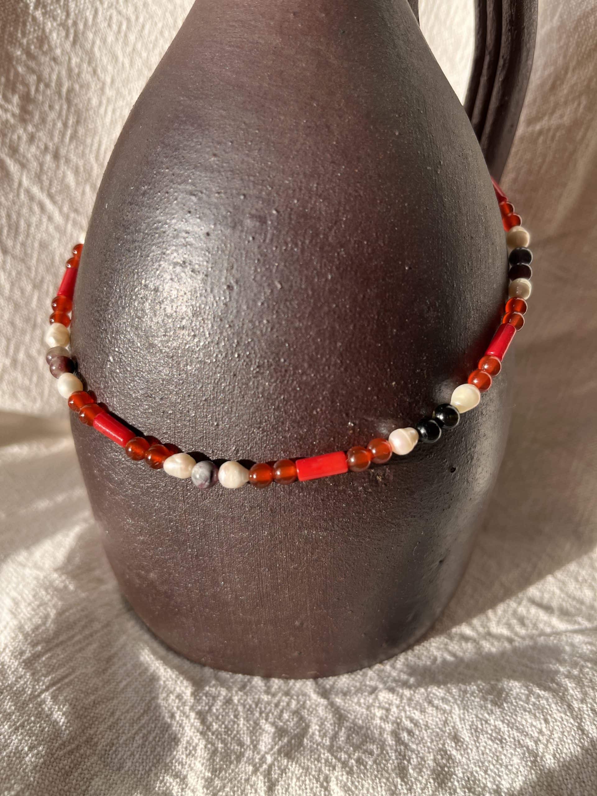 La douceur des perles d’eau douce et des coraux s’unit à la vitalité de la cornaline, pierre de l’élan et de la créativité, tandis que la tourmaline invite à l’ouverture de l’intuition et à l’harmonisation des émotions.